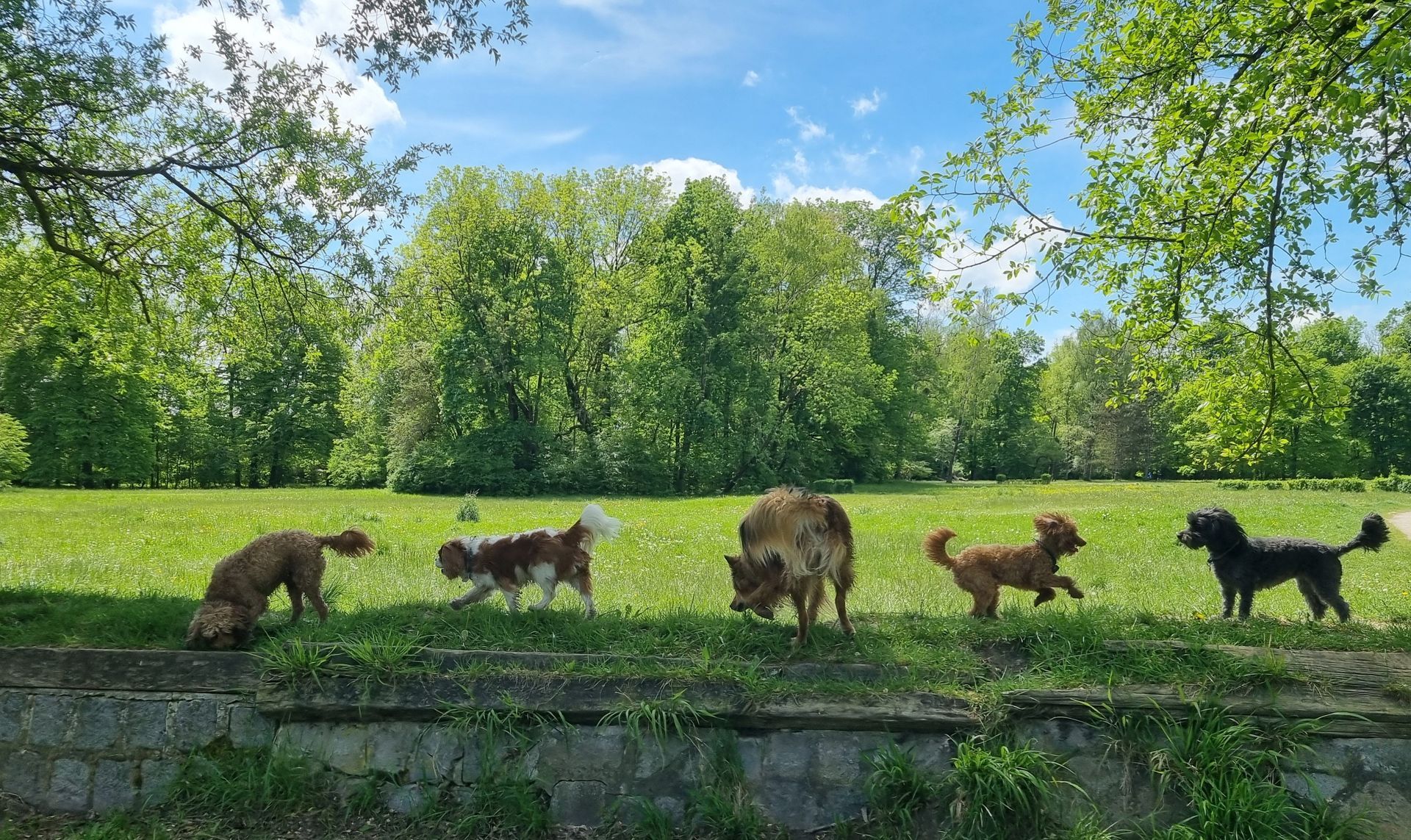 Die Hunde werden vormittags mit dem Auto von mir abgeholt und wir laufen dann eine schöne Runde in den nahegelegenen Grünanlagen wie Messepark Riem, Hundemeile Neubiberg, Truderinger Wald, nördlicher Englischer Garten, Perlacher Forst oder südliche Isar.